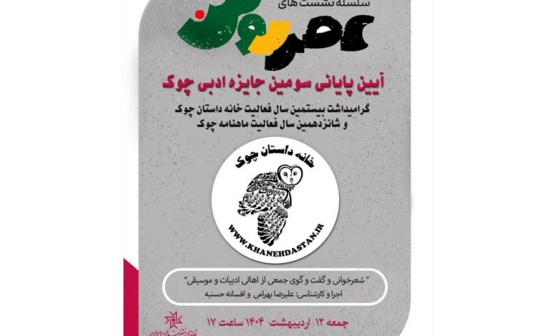 به گزارش انرژی ورزشی، نشست اردیبهشت از سلسله نشستهای عصر روشن در خانه هنرمندان ایران، با محوریت جایزه ادبی چوک برگزار میشود. در آیین پایانی سومین جایزه ادبی چوک، همچنین بیستمین سال فعالیت خانه داستان چوک و شانزدهمین سال فعالیت ماهنامه ادبی چوک، گرامی داشته میشود.