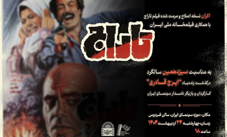 به مناسبت سیزدهمین سالگرد درگذشت ایرج قادری کارگردان و بازیگر نامدار سینمای ایران، با همکاری فیلمخانه ملی ایران، نسخه اصلاح و مرمتشده فیلم «تاراج» ساخته سال ۱۳۶۳ این کارگردان در موزه سینما به نمایش درخواهد آمد.