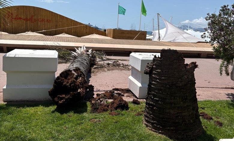 بخشی از محل برگزاری جشنواره کن پس از سقوط یک درخت نخل روی پیادهرو که گفته میشود منجر به زخمی شدن یک عابر پیاده شده است، بسته شد.