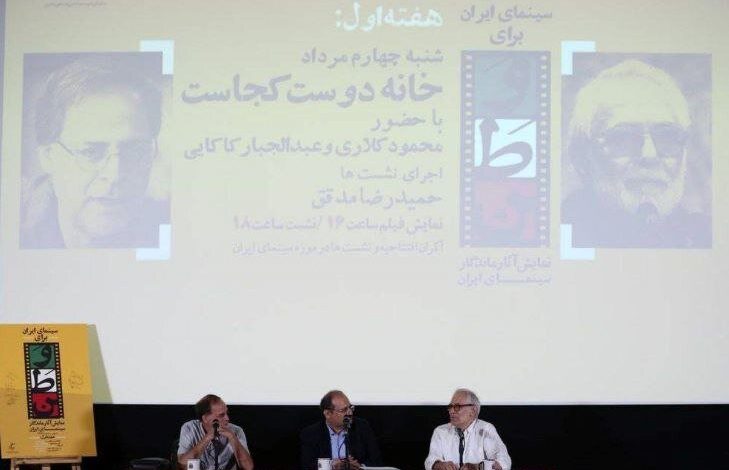 به گزارش خبرگزاری خبرآنلاین به نقل از ادارهکل روابطعمومی سازمان سینمایی، اولین نشست برنامه «سینمای ایران برای وطن» با نمایش نسخه مرمتشده «خانه دوست کجاست؟» ساخته زندهیاد عباس کیارستمی شنبه ۴ مردادماه با حضور محمود کلاری و عبدالجبار کاکایی و با اجرای حمیدرضا مدقق در موزه سینما برگزار شد.