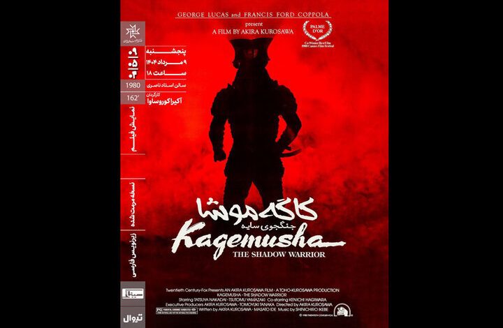 به گزارش خبرگزاری خبرآنلاین به نقل از روابط عمومی خانه هنرمندان ایران، نسخه مرمتشده فیلم سینمایی «کاگهموشا: جنگجوی سایه» (۱۹۸۰) بهکارگردانی آکیرا کوروساوا ساعت ۱۸ پنجشنبه ۹ مرداد ۱۴۰۴ در سالن ناصری خانه هنرمندان ایران به نمایش درمیآید.