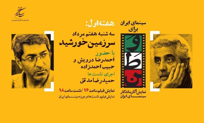 به گزارش خبرگزاری خبرآنلاین به نقل از ادارهکل روابطعمومی سازمان سینمایی، روز چهارم برنامه «سینمای ایران برای وطن» با نمایش نسخه مرمت شده فیلم «سرزمین خورشید» ساخته احمدرضا درویش در موزه سینما برگزار میشود. نمایش این فیلم ساعت ۱۶ فردا دوشنبه ۶ مردادماه در سالن فردوس خواهد بود و در ساعت ۱۸ چهارمین نشست با حضور احمدرضا درویش و حبیب احمدزاده با اجرای حمیدرضا مدقق برگزار خواهد شد.