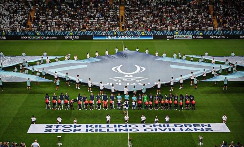 قبل از آغاز دیدار تیمهای فوتبال پاریسنژرمن و تاتنهام در سوپرکاپ اروپا که در ایتالیا در حال برگزاری است، یوفا با قراردادن بنری روی زمین که حاوی شعار «کشتن کودکان را متوقف کنید» «کشتن غیرنظامیان را متوقف کنید» بود، اقدامات جنایتکارانه رژیم صهیونیستی در غزه را محکوم کرد.