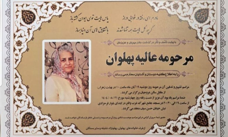 درگذشت عالیه پهلوان و اعلام تاریخ مراسم یادبود