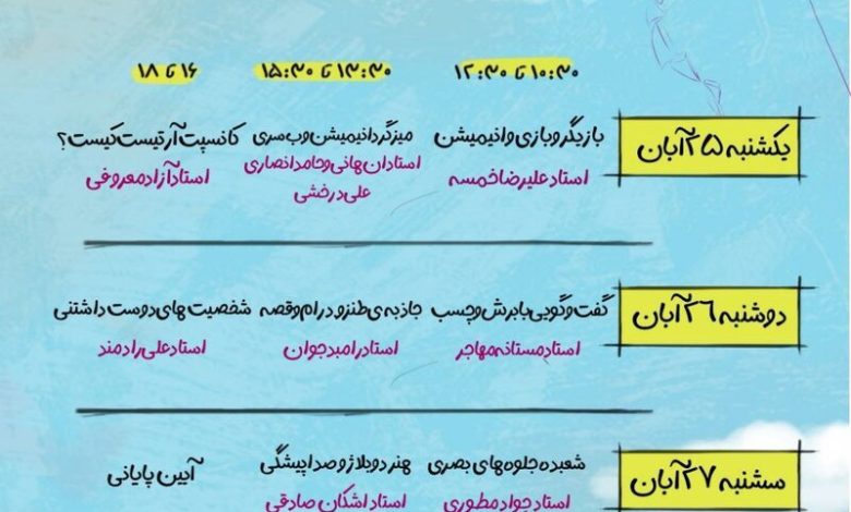 براساس جدول برنامه ، در رویداد امسال فرصتی برای گفتگو، تبادل تجربه و آشنایی با دیدگاههای هنرمندان فعال در حوزه انیمیشن و تصویر متحرک ایران فراهم آمده است.